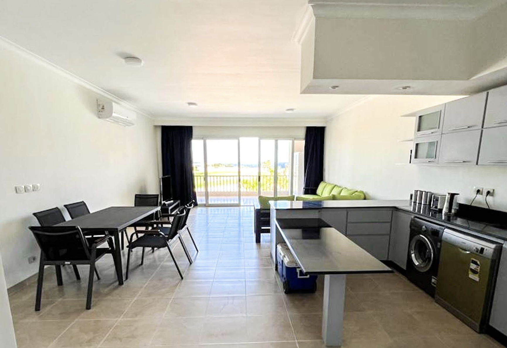 Das Apartment überzeugt durch helle Räume, offene Grundrisse und große Fensterflächen, die den Blick auf das Meer und den Golfplatz freigeben.